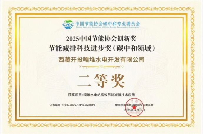 近日,中國(guó)節(jié)能協(xié)會(huì)2025年度創(chuàng)新獎(jiǎng)獲獎(jiǎng)名單正式公布,西藏開(kāi)投嘎堆水電公司申報(bào)的“嘎堆水電站高效節(jié)能減排技術(shù)應(yīng)用”項(xiàng)目榮獲“節(jié)能減排科技進(jìn)步獎(jiǎng)(碳中和領(lǐng)域) 二等獎(jiǎng)”。