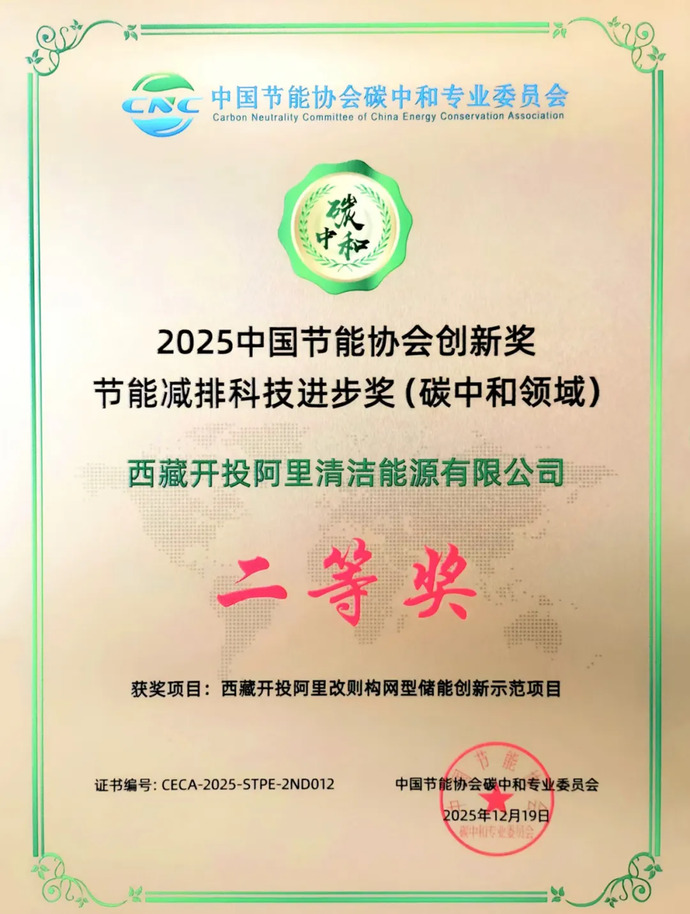 近日,由中國質(zhì)量認證中心、中國節能協(xié)會(huì )碳中和專(zhuān)業(yè)委員會(huì )聯(lián)合頒發(fā)的2025中國節能協(xié)會(huì )創(chuàng )新獎名單揭曉,由西藏開(kāi)投阿里清潔能源公司投資建設的阿里改則構網(wǎng)型儲能創(chuàng )新示范項目獲“節能減排科技進(jìn)步獎(碳中和領(lǐng)域)二等獎”。